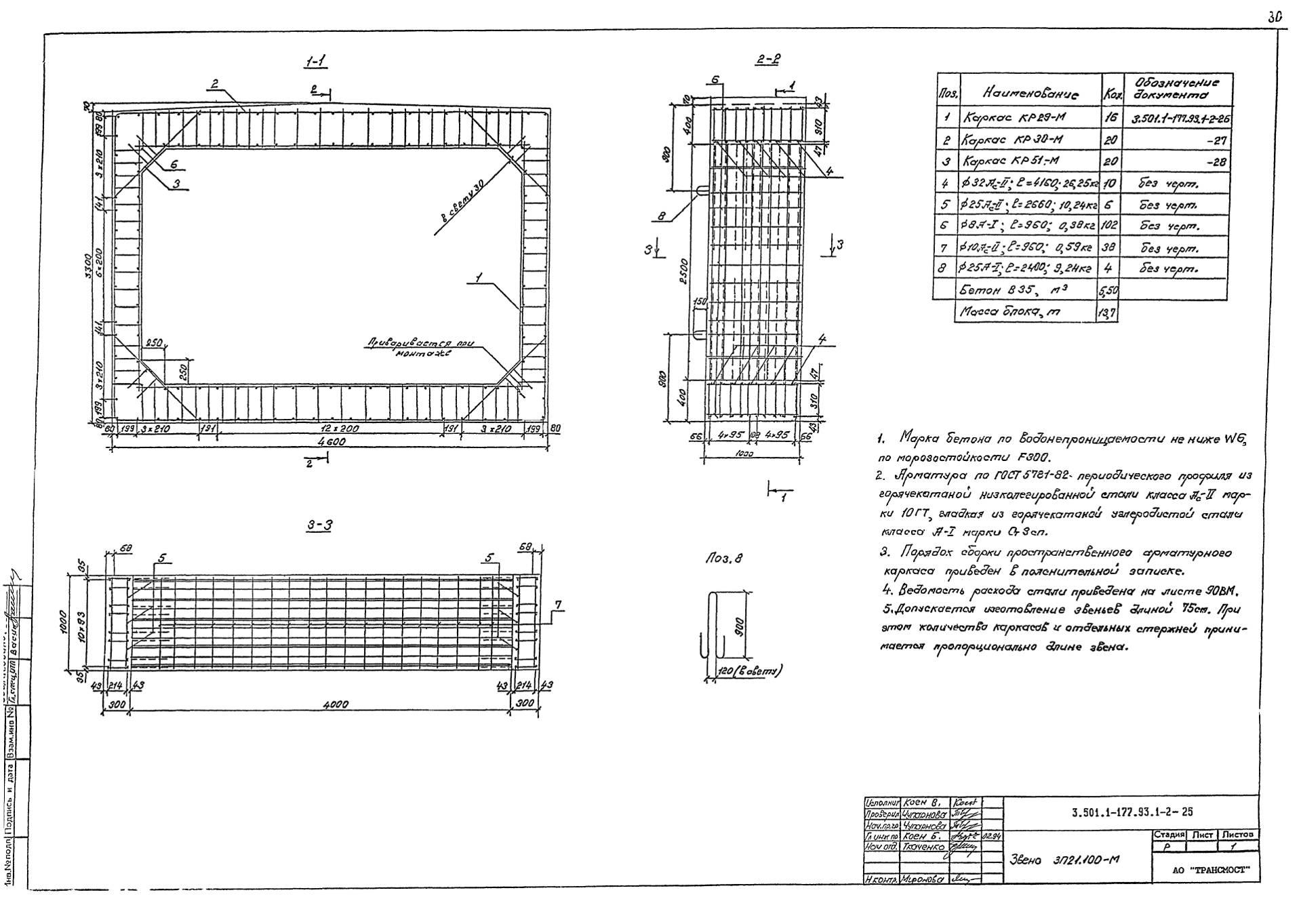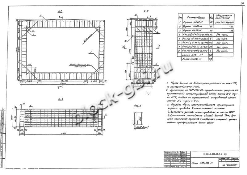 Трубы водопропускные и ЗП 21.100-М для прямоугольных водопропускных труб изготавливаются в соответствии с ГОСТ 24547-81 «Звенья железобетонные водопропускных труб под насыпи автомобильных и железных дорог», ОСТ 35-27.0-85 «Звенья железобетонные круглых и прямоугольных водопропускных труб под железные и автомобильные дороги» из тяжелого конструкционного бетона. Класс бетона по прочности на сжатие принимается не ниже В15. Класс бетона по морозостойкости назначается в зависимости от климатического района строительства не ниже: F200 – при средней месячной температуре воздуха наиболее холодного месяца в районе строительства выше -15˚С; F300 – при средней месячной температуре воздуха наиболее холодного месяца в районе строительства ниже -15˚С. Класс бетона по водонепроницаемости принимается не менее W6. Дополнительно в бетонную смесь изделий вводятся вохдухововлекающие, газообразующие и пластифицирующие добавки для сопротивления воздействию агрессивных химических веществ, содержащихся в воде и грунте.